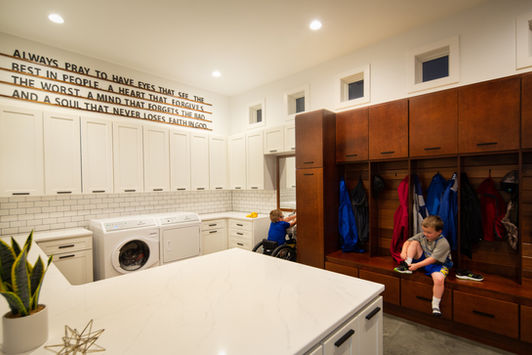 Palmer was born with Spina Bifida. Palmer was also born with parents and brothers that do everything they can to make sure he gets to do what he wants to do. Prior to this project, the family was living in a multi-level, sunken living room, 1970’s kind of house and it became very evident that Palmer was getting left out and his family was working really hard to keep up with four boys. If the cousins went downstairs, Palmer was left upstairs. If the kids went outside, Palmer needed help from mom or dad to get ready to go outside. Unfortunately, by the time Palmer was ready to go outside, the kids were already coming inside. Following the families lead, the design team has taken great pride in making sure this house is awesome for all of its inhabitants. At the end of the day, the design is inspiring, it functions for the entire family and Palmer gets to be a part of the action, no matter what. As an architect, it is a treat to see a direct connection between design and the user, seeing firsthand that design matters. In this case, it is the greatest sight when Palmer gets to slap hockey pucks, visit his dog in the garage, ride the 4-wheeler and even listen to his mom to wash up before dinner…or, better yet, help make dinner. Palmer’s House is “zero barriers,” by design…and mom and dad have their space too.